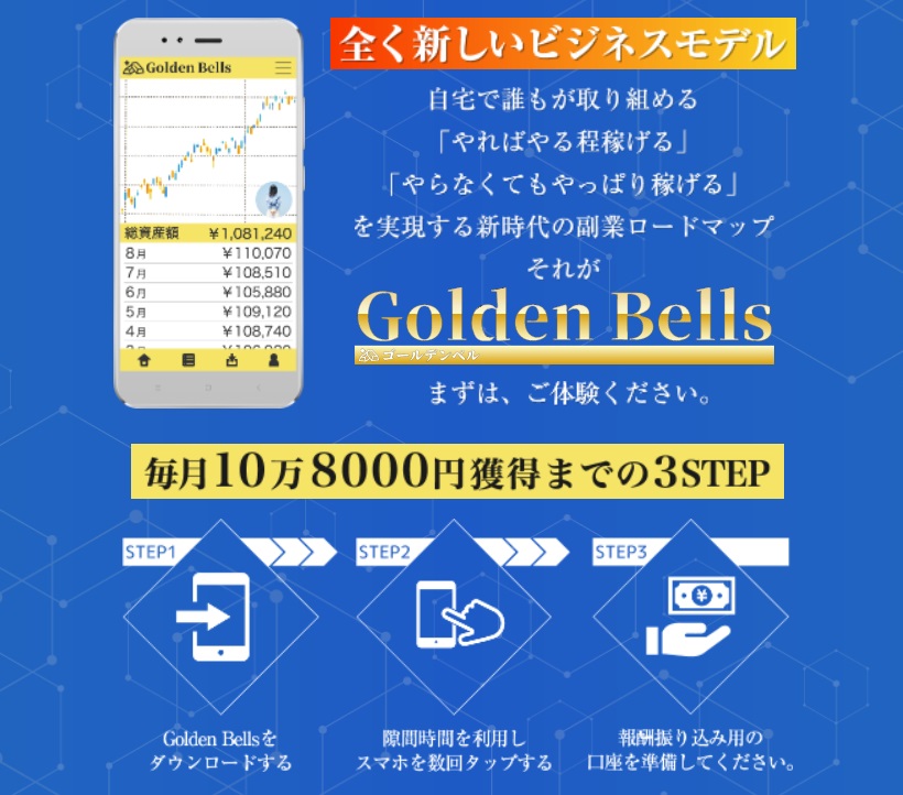 今回はスマホ1台で完結!毎月10万8000円という触れ込みのGolden Bellsについて調べてみました。