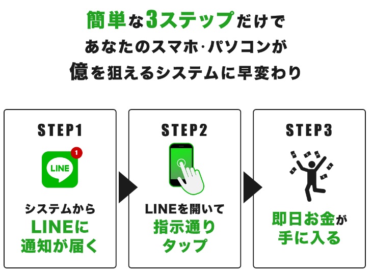 今回は年利500%以上、再現性100%というということで、LINEの指示通りにタップするだけで即日お金が手に入るとハッキリ記載してあります。