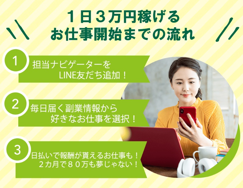 すぐにこちらの案件の詳細を知りたいという方は、下記からお友だち登録をしてください。登録してくれた方には実際に私がやっている副業や、本当に稼げるお得な情報を無料でお伝えします!