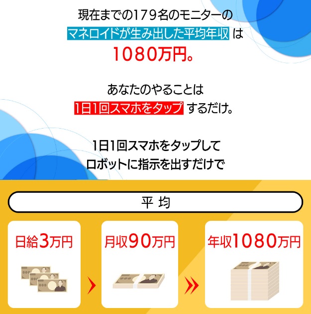 さらに言えば今回の案件ではスマホから1日1回、そのロボットなるものに指示を出してさえいれば平均年収1080万円を稼げるかのように書かれているので、まとめると最終的には利益が確定しているかのようなことになっているようですが、こうした利益が確定しているかのような書き方はいかがなものなんでしょうね・・・。