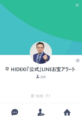 どうやら公式LINEに遷移するようですね、アカウント名はHIDEKI『公式』LINEお宝アラートというもので、現状まで登録者は「259人」となっているようです。