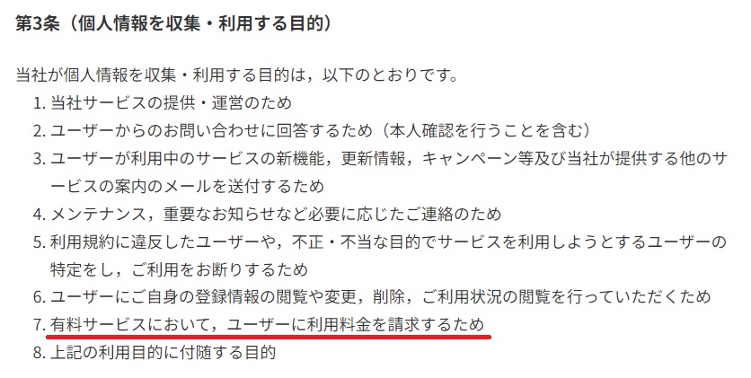 それも勿論気になるポイントですし、気を付けなければならないポイントにもなりますが、それよりも気になるのはこの「有料サービスにおいて,ユーザーに利用料金を請求するため」というところです。