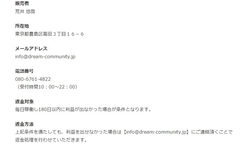 こちらが特商法表記ですが、個人で運営しているようですね。