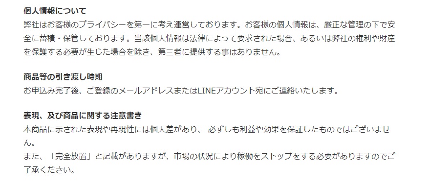 それだけでなく、【表現、及び商品に関する注意書き】に「本商品に示された表現や再現性には個人差があり、 必ずしも利益や効果を保証したものではございません。」と書かれているので、高額な料金を支払ったからと言って絶対に稼げるわけではありません。