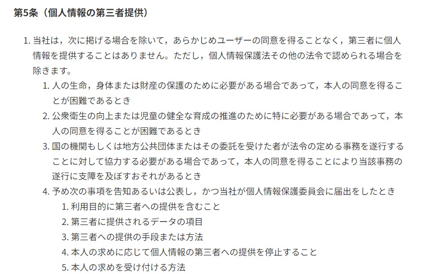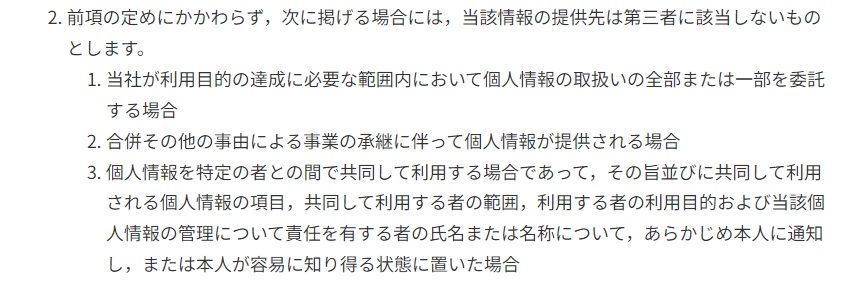 では次にプライバシーポリシーを確認してみましょう。プライバシーポリシーは長いので、個人情報の第三者共有に関する部分をピックアップしてみました。