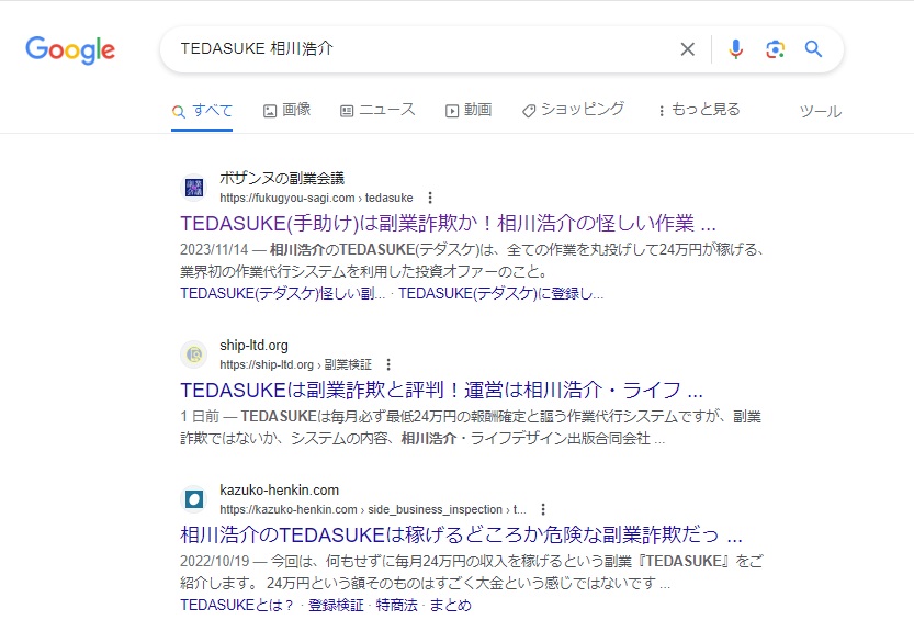 ちなみに【TEDASUKE】を検索するとこのようなページがヒットします。