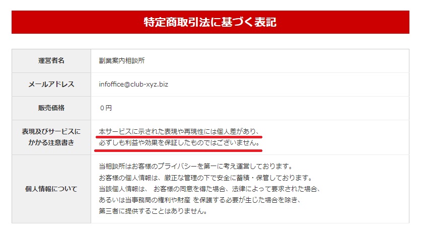 それに【表現及びサービスにかかる注意書き】には「本サービスに示された表現や再現性には個人差があり、必ずしも利益や効果を保証したものではございません。」と書かれています。