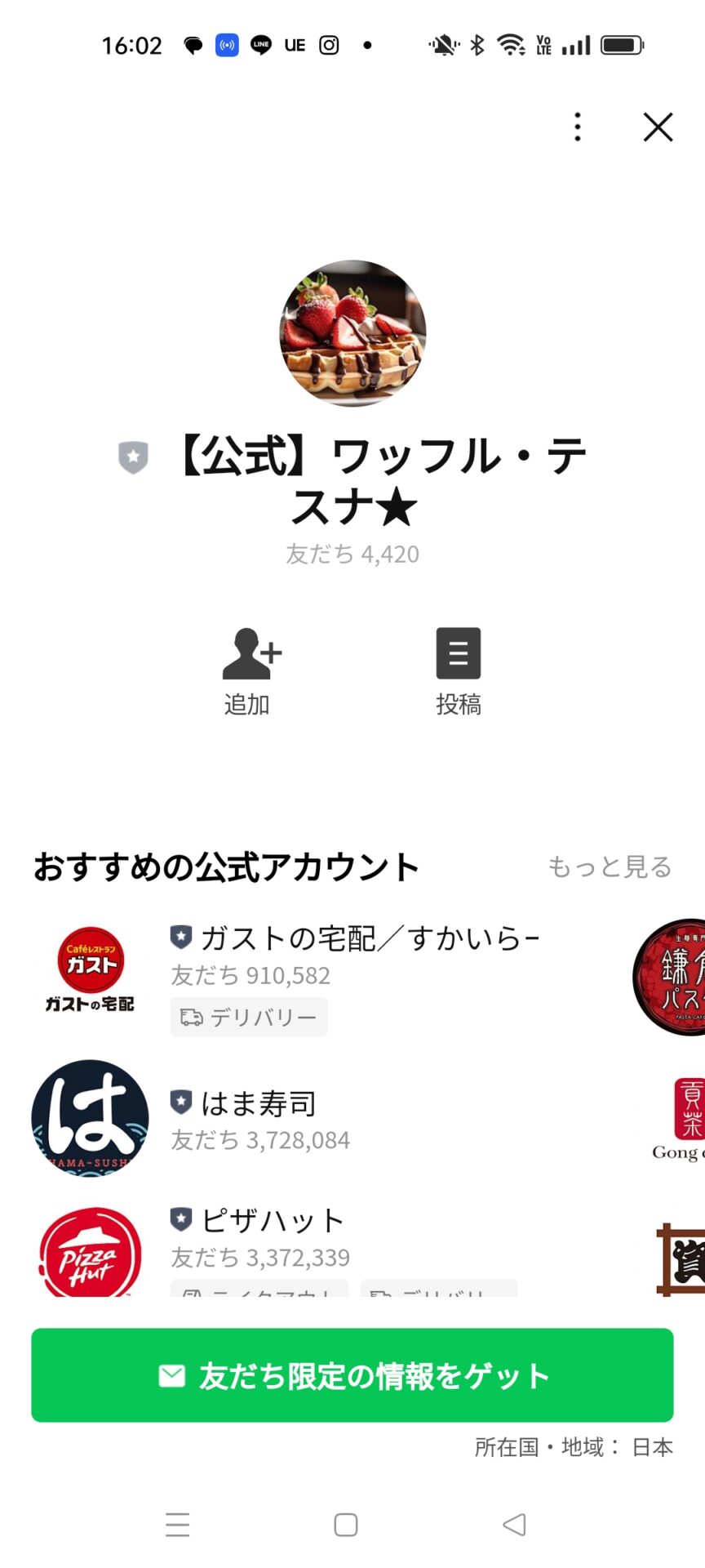 どうやら公式LINEに遷移するようですね、アカウント名は【公式】ワッフル・ステナ★というもので、現状まで登録者は「4420人」となっているようです。