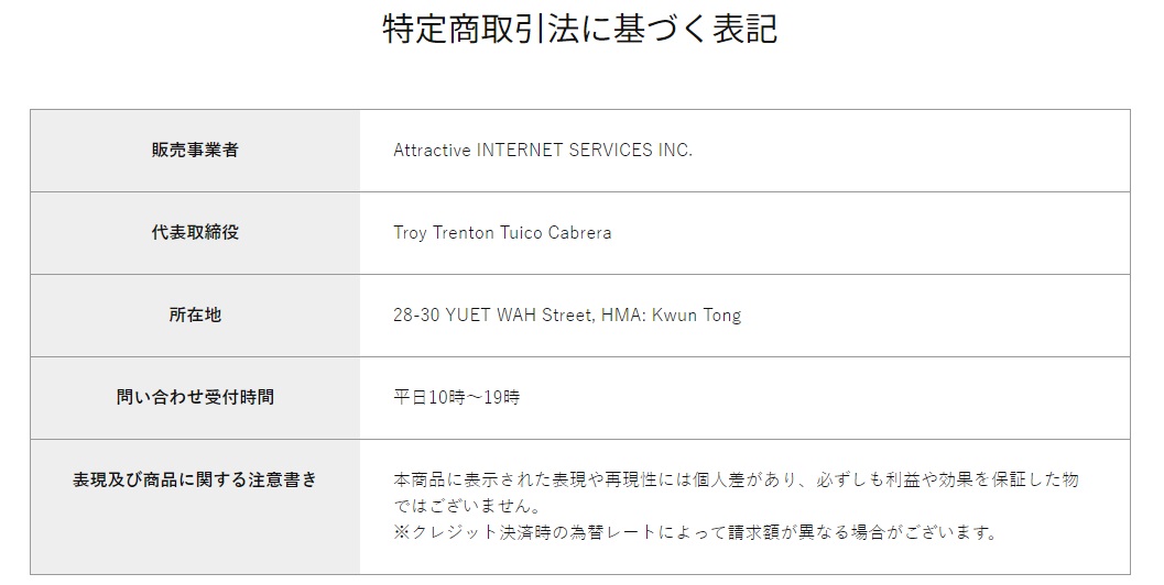 こちらがここの特商法表記ですが、会社は海外のようですね。