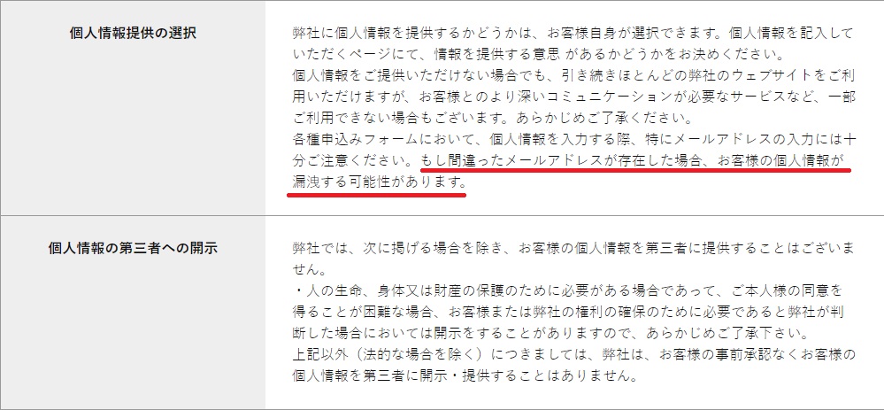 「もし間違ったメールアドレスが存在した場合、お客様の個人情報が漏洩する可能性があります。」と書かれていますが、これはどういう意味なのでしょうか。