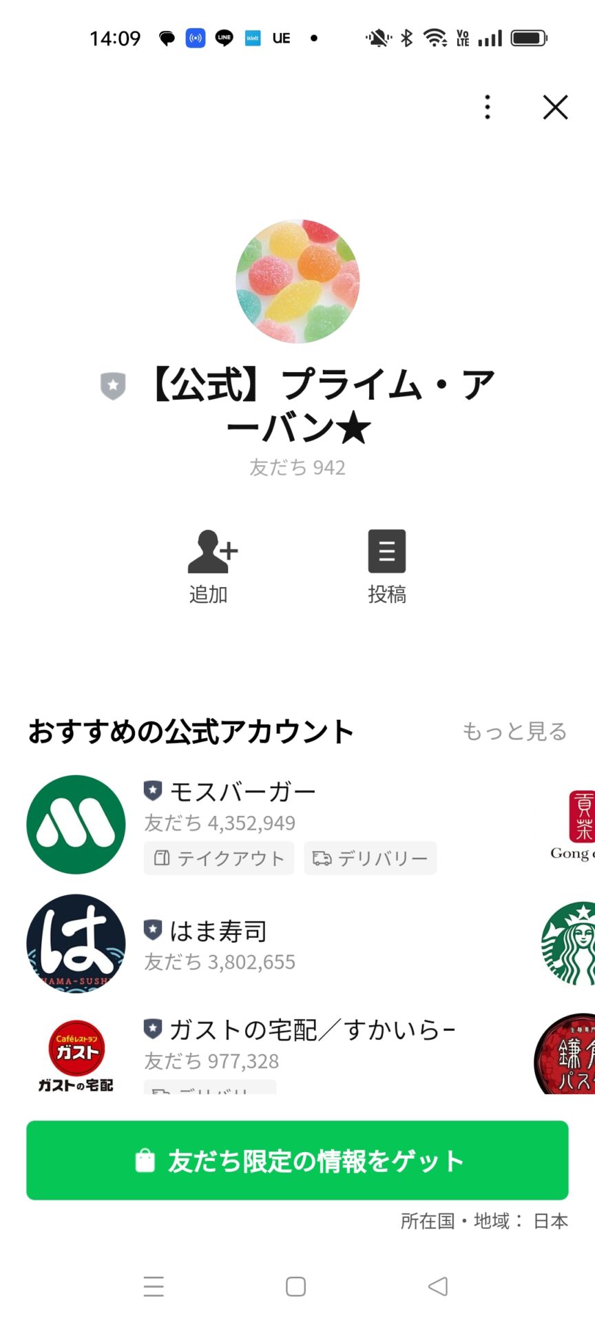 どうやら公式LINEに遷移するようですね、アカウント名はプライム・アーバン★というもので、現状まで登録者は「942人」となっているようです。