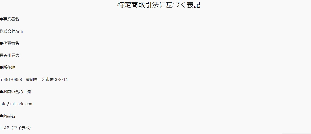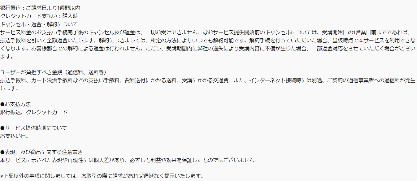 こちらが特商法表記ですが、必要事項はしっかりと明記されています。