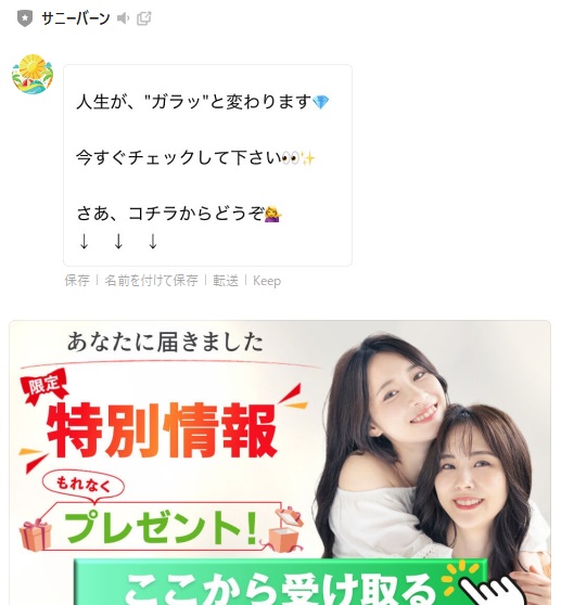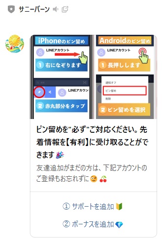 どうやら公式LINEに遷移するようですね、アカウント名はサニーバーンというもので、現状まで登録者は「502人」となっているようです。