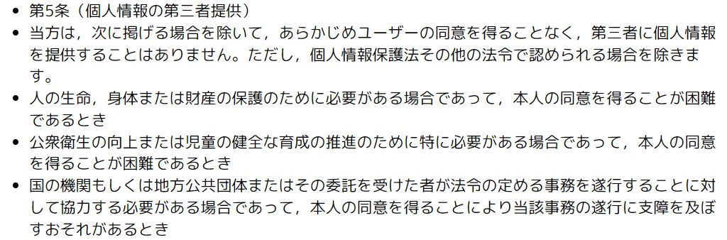 けれど一旦プライバシーポリシーをチェックしていきましょう!プライバシーポリシーは長いので、個人情報に関する部分をピックアップしてみました!