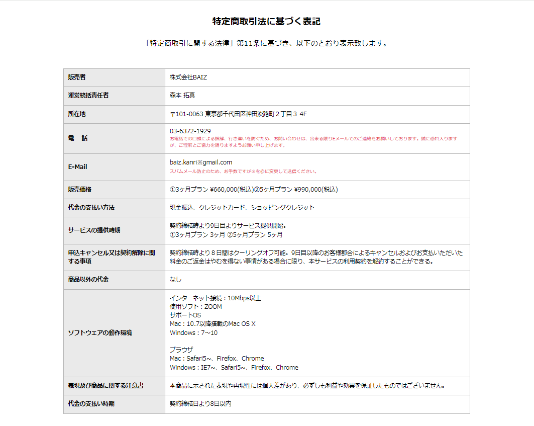 早速BAIZ AI COLLEGEの特商法表記やプライバシーポリシーについて調べてみたのですが、特商法の記載に気になる点があります。
