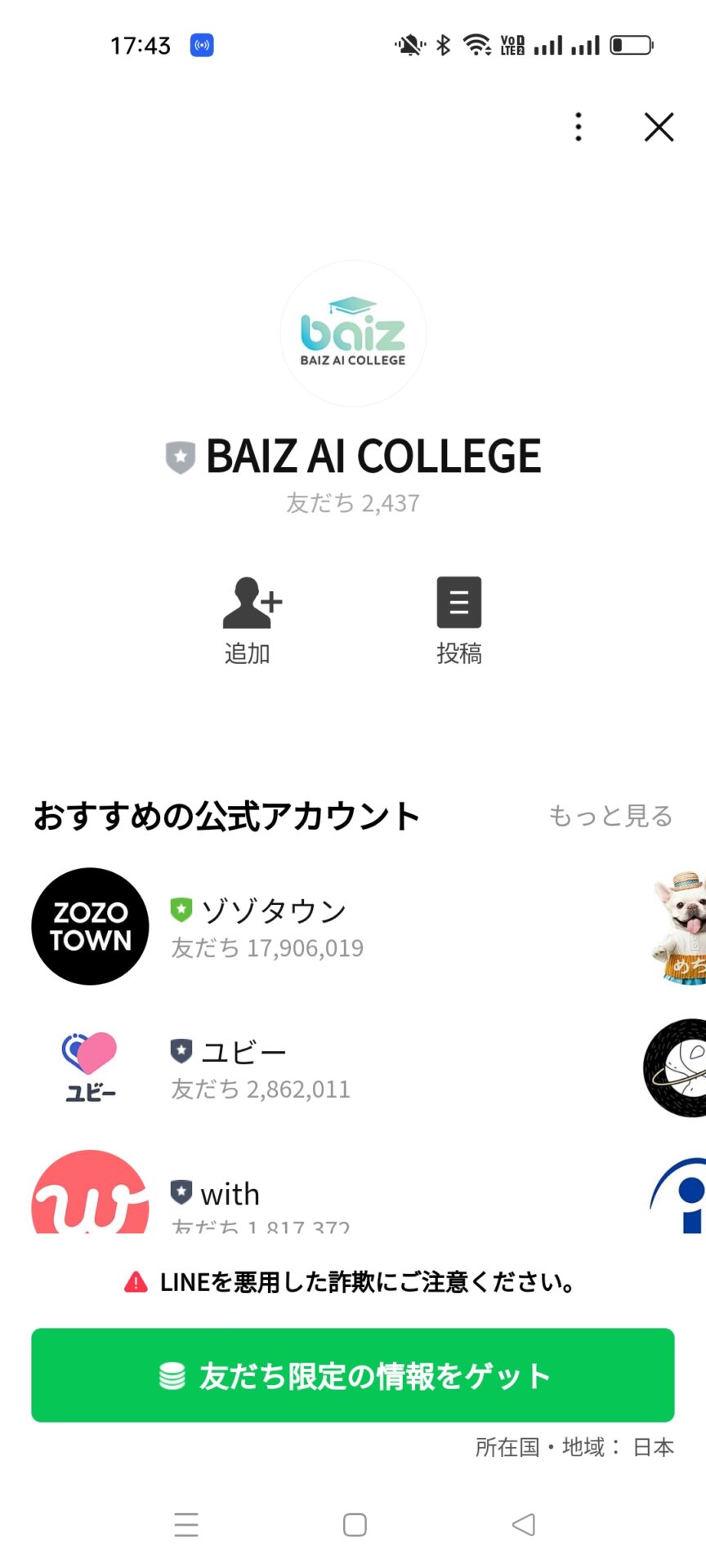 どうやら公式LINEに遷移するようですね、アカウント名はBAIZ AI COLLEGEというもので、現状まで登録者は「2437人」となっているようです。