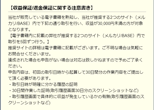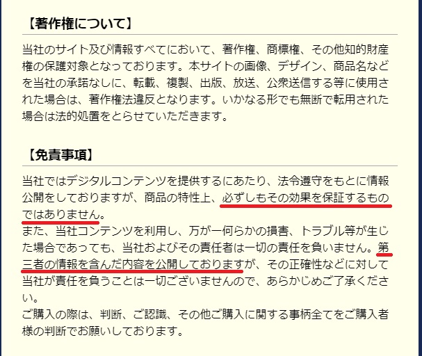 そして【表現及び商品に関する注意書き】には、「本商品に示された表現や再現性には個人差があり、必ずしも利益や効果を保証したものではございません。いかなる場合においても返金規定以外の購入後の返品、返金は受け付けません。」と書かれています。